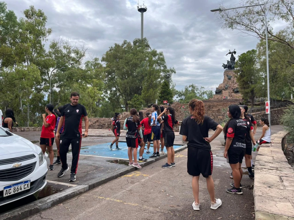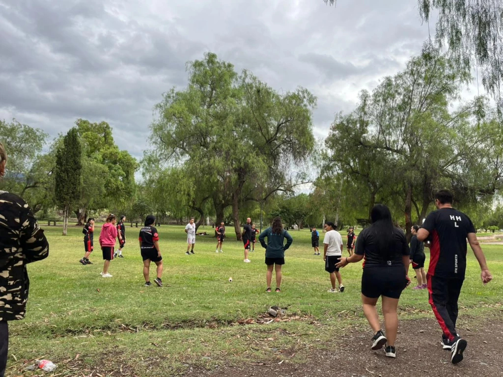 El fútbol femenino de Huracán Las Heras continúa entrenando en el Parque General San Martín, incluso bajo la lluvia.
